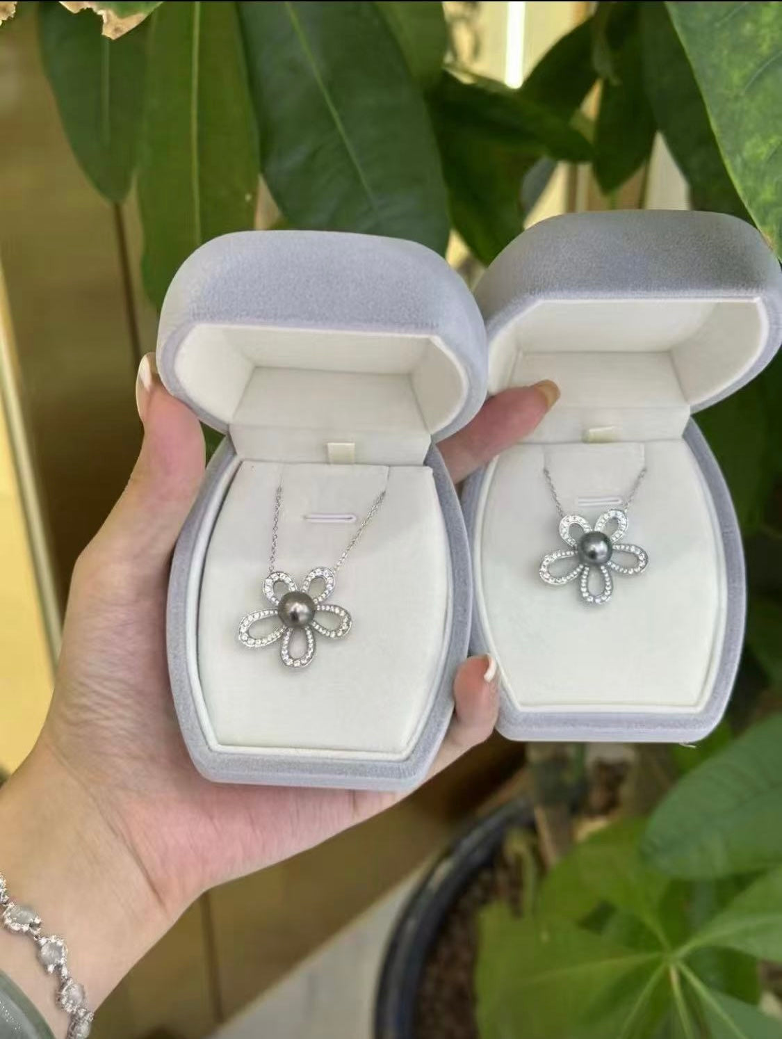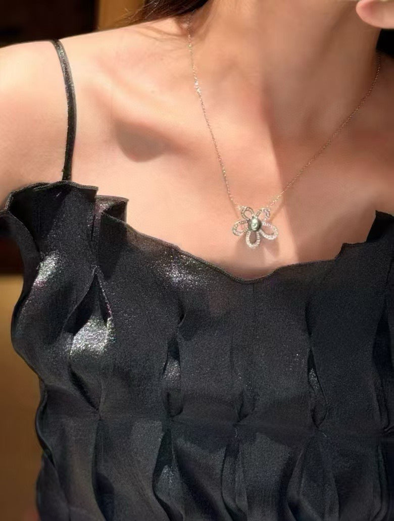 This enchanting necklace features a lustrous black Tahitian pearl, present with big flower style design allows the captivating beauty of the pearl to take center stage.
